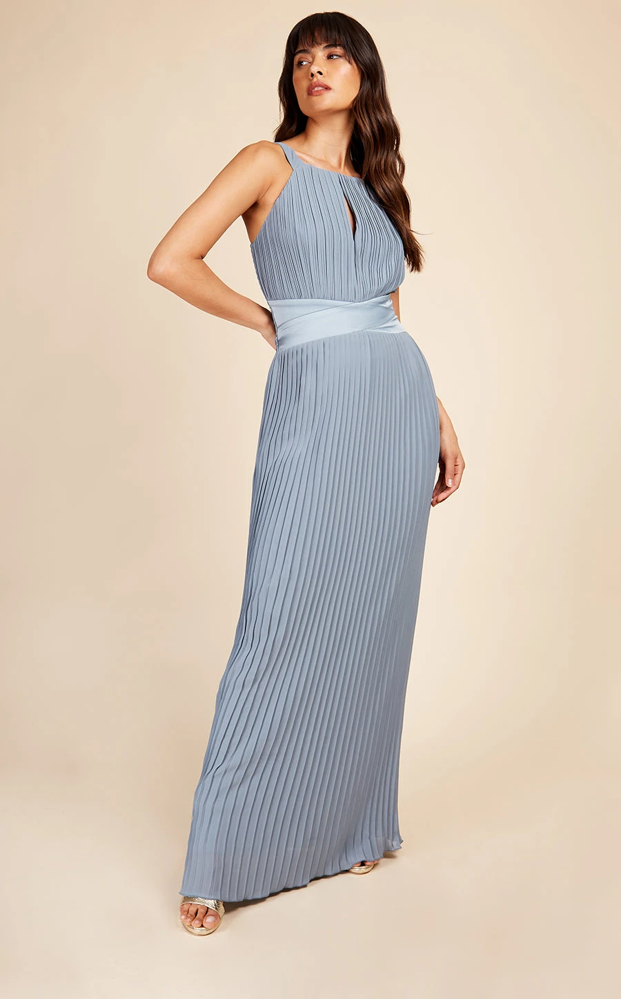 Constructed from delicate chiffon, this gorgeous dusty blue dress features a cut out neck and waist-cinching satin sash.