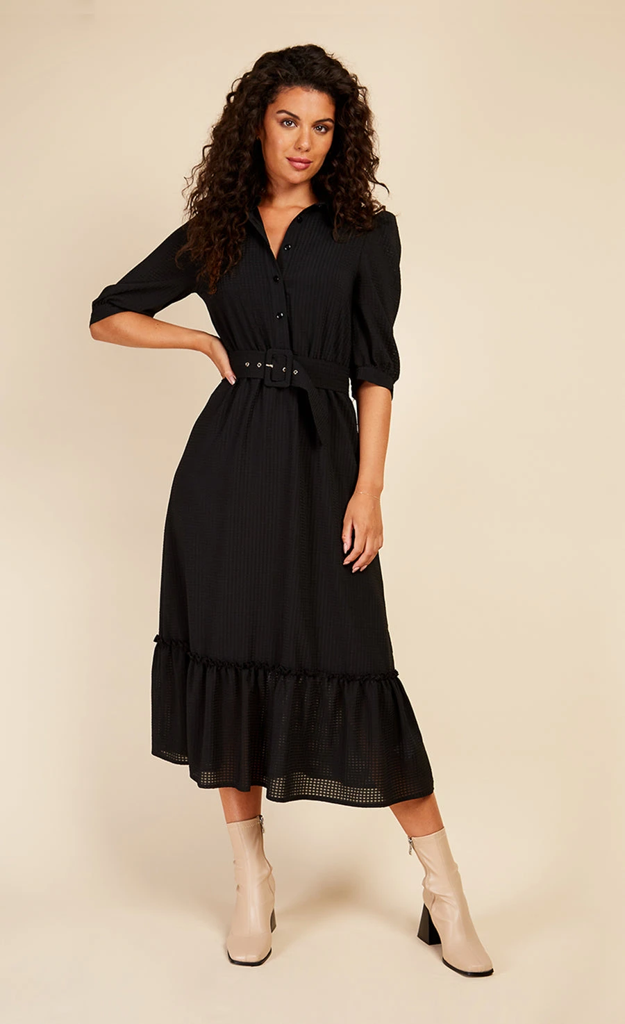 The perfect black dress doesn’t exiโฆ Oh yes, it does, and it comes in the form of this seersucker midi. Cut in a classic shirt style with a waist-defining belt, sheer puff sleeves and a tiered hem give it an ultra-feminine feel. Style with ankle boots now and sandals come summer.ย