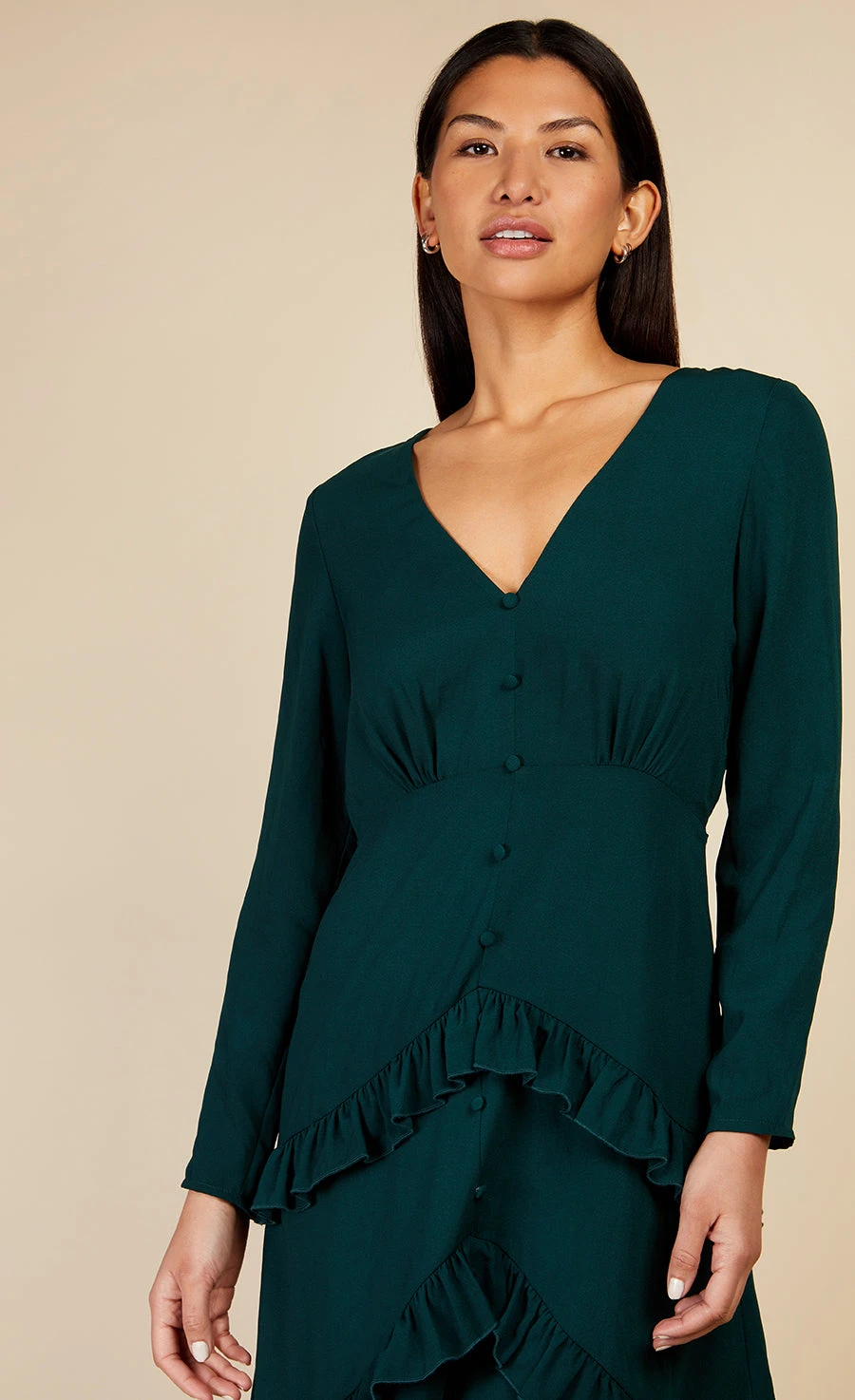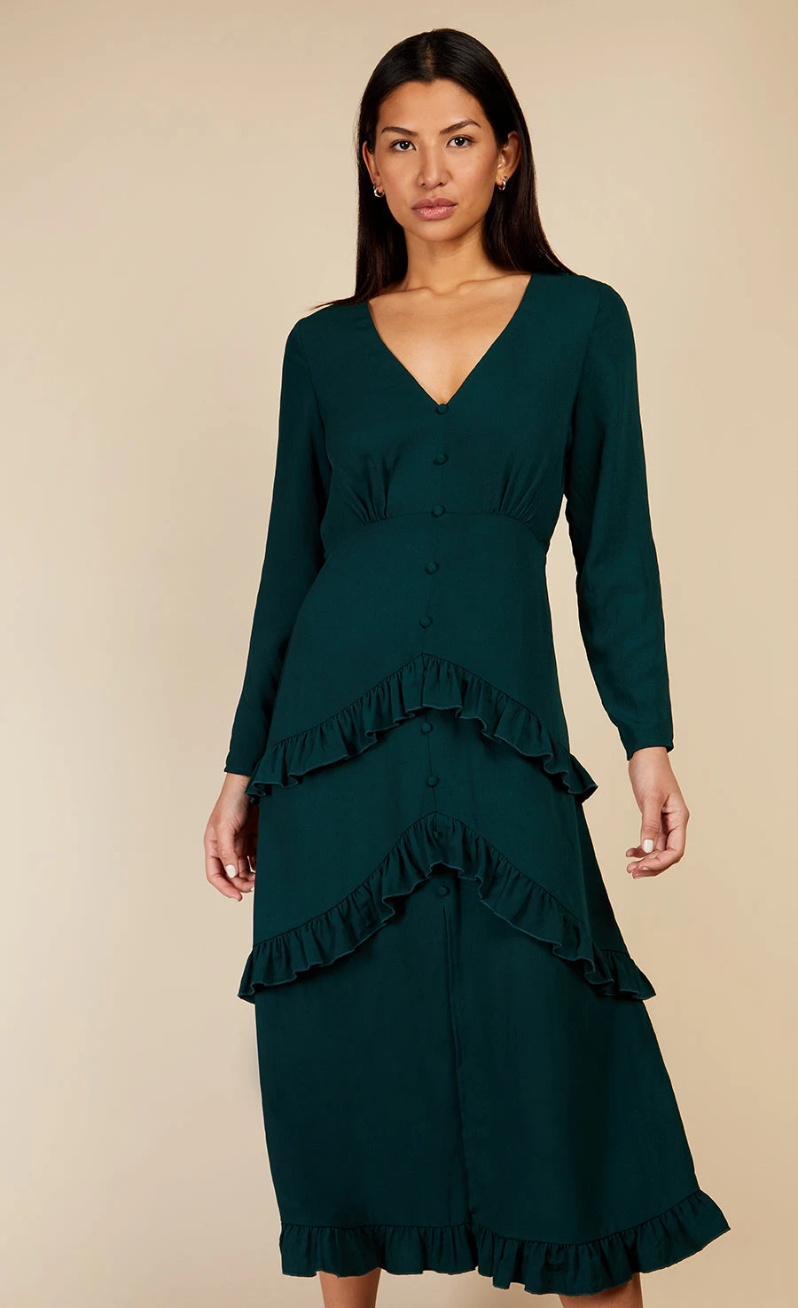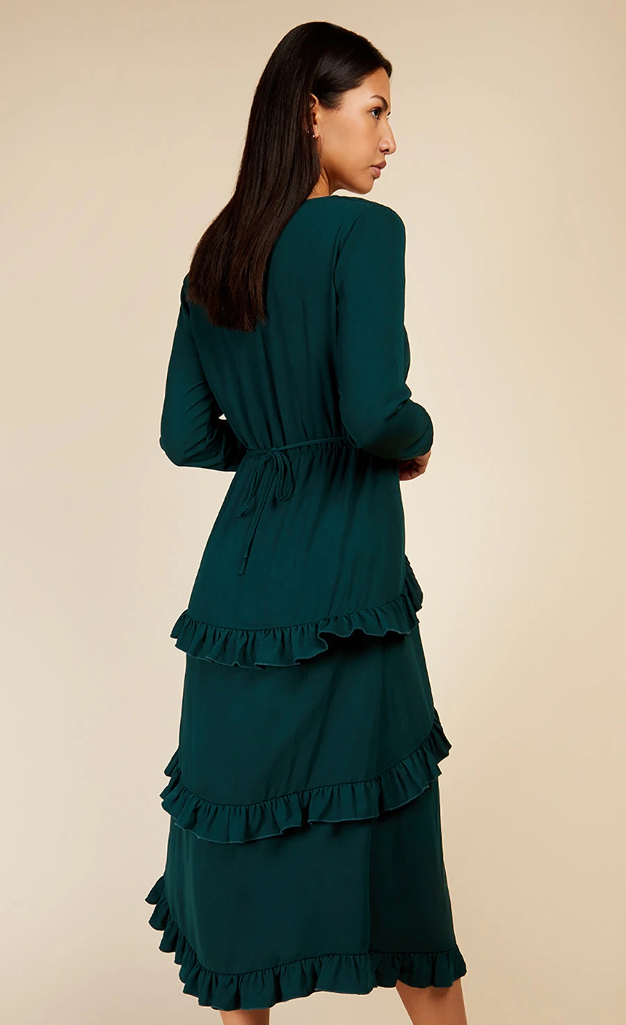 Frills for days! Emerald green is in and we are so here for it – make the most elegant of statements in this V-neck midi, featuring cinched in waistline, tiered frill detail at hem and centre slit. Just add a strappy heel and let your dress do the talking.