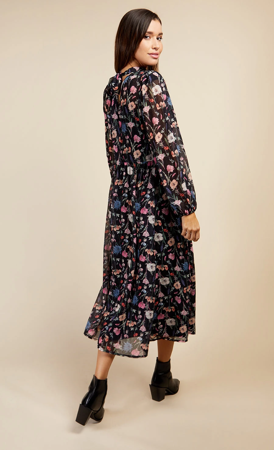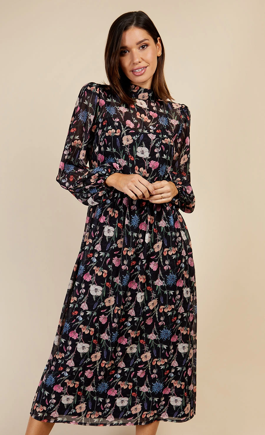 Floral chiffon midi dress with high neck and ultra-feminine tie-neck detail with keyhole feature at the back. Long blouson sleeves with elasticated cuffs. Slip included. Print placement may vary.