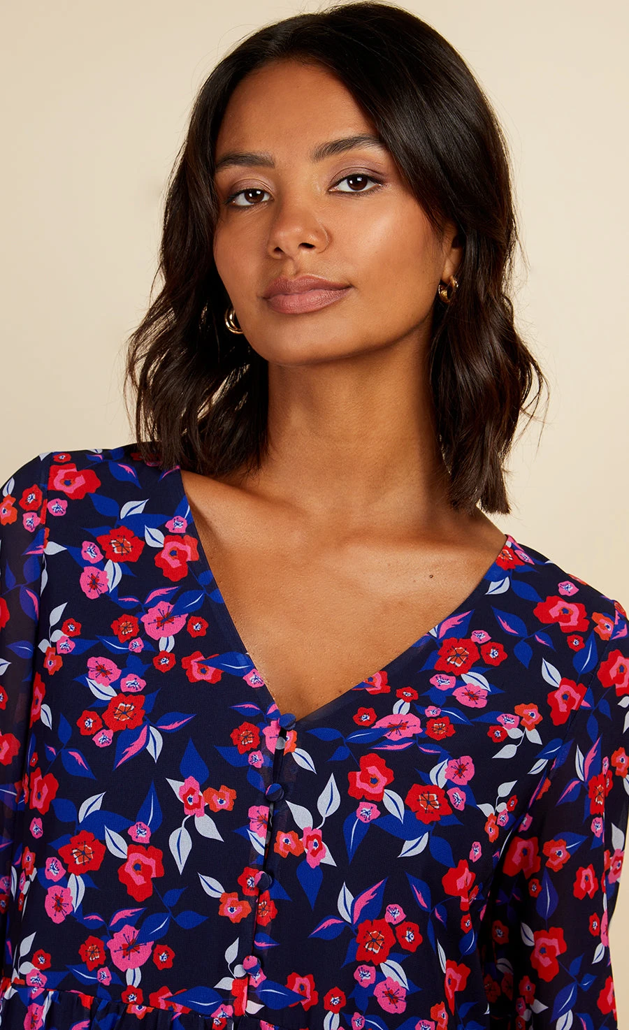 Bold floral print adds an on-trend twist to the tiered smock dress in this timeless wardrobe staple. An empire waistline and tiered ruffle hem promise to give a feminine flair to your Winter wardrobe. Style with biker boots and a PU jacket. Print placement may vary.
