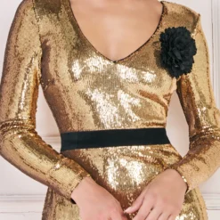 Embellished with glistening gold sequins, this dress will dazzle on the dance floor – or at that fancy do. Designed to showcase your curves, it features a plunging neckline, ruched waist and leg-flashing mock wrap hem. Complete the look with heels and a clutch.