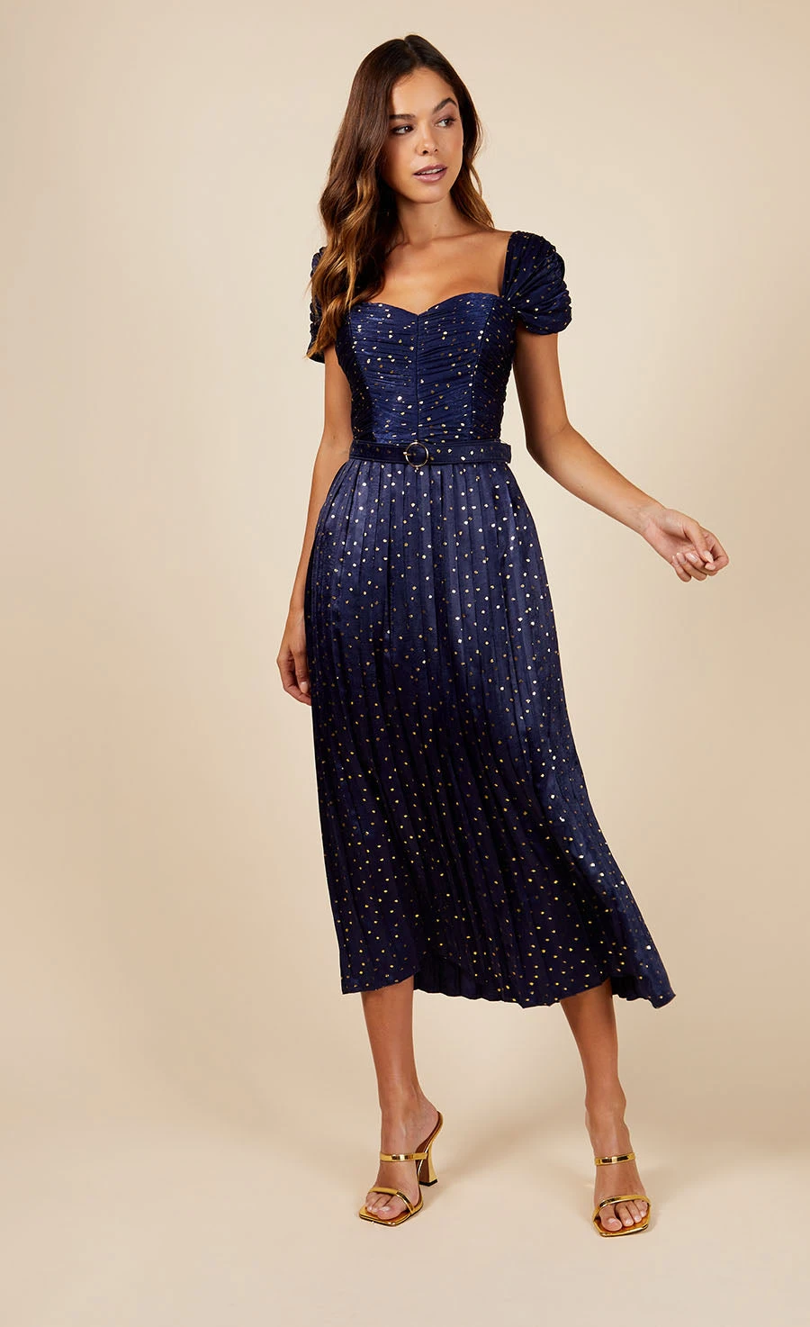 Featuring an ultra-flattering top – sweetheart-neckline, waist-defining belt – flecked with gilded polka dots, a pleated midi skirt and ruched cap sleeves make this a special occasion stunner. Print placement may vary.