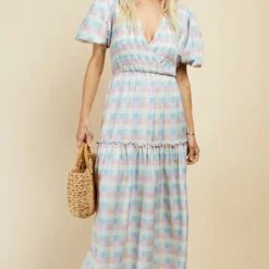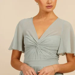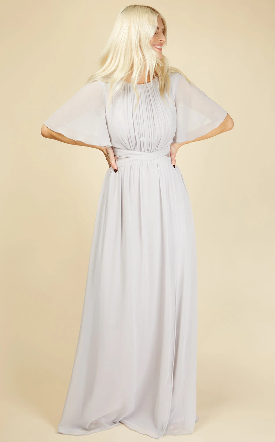 With sheer floaty cap sleeves, a soft neckline and cross over cut out waist, this romantic gown is a stunning option. The ice grey shade is impossibly chic and the thigh split adds a little sexiness.