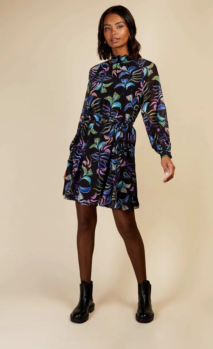 Cold weather florals are trending and this chiffon mini is ticking all of the boxes. Designed to fit and flare with a self-tie belt and featuring a high neck and sheer sleeves. Style with a block heel ankle boot and oversized coat. Print placement may vary.