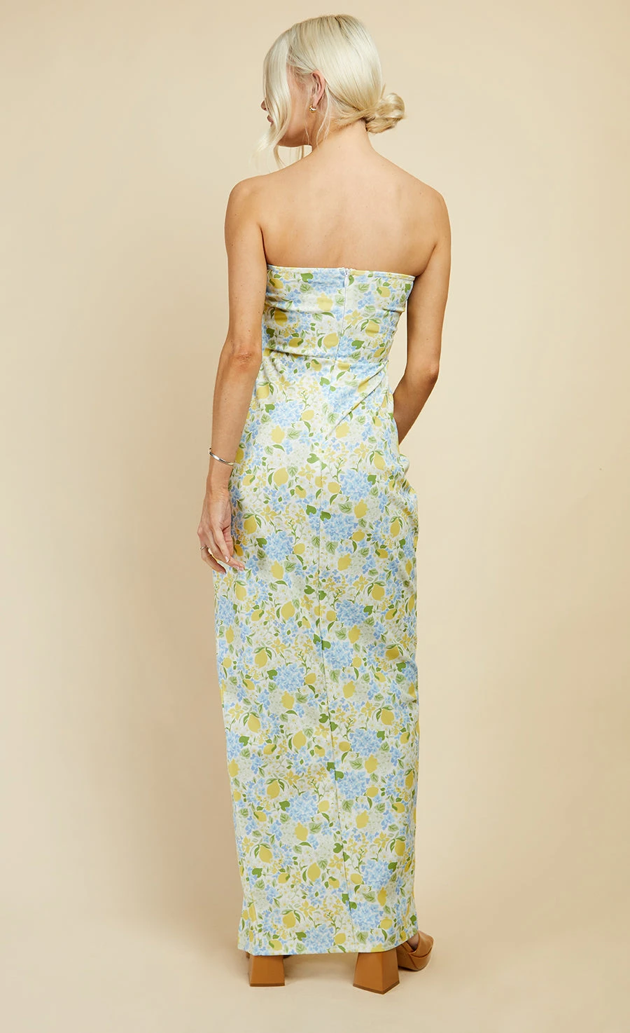 With its pastel print and oversized bow, this dress is like a ray of wearable spring sunshine. Topped with an elegantly sexy bandeau neckline, it cinches your smallest part – just under the bust – before falling into a chic split hem column skirt. Cream heels make the perfect accessory. Print placement may vary.