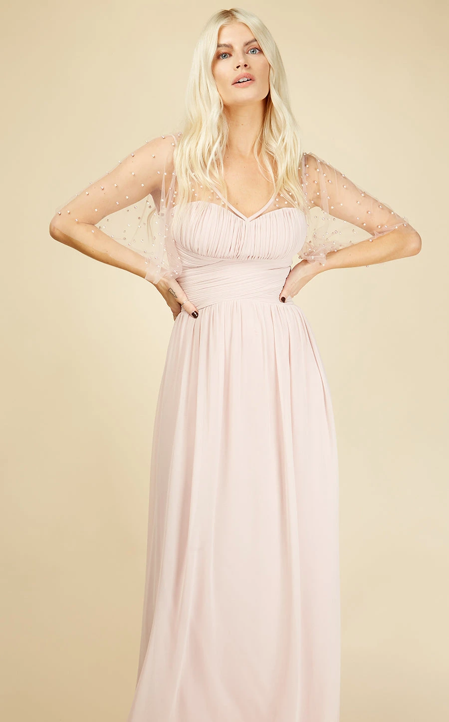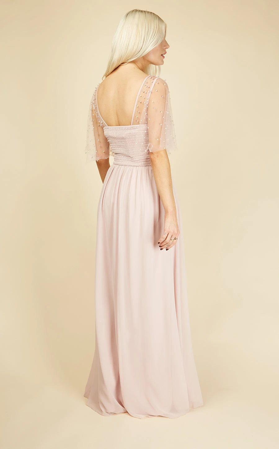 With floaty angel sleeves, a flattering V-neckline and cross over waist, this romantic gown is a stunning option. The pretty blush shade looks gorgeous with metallic accessories.