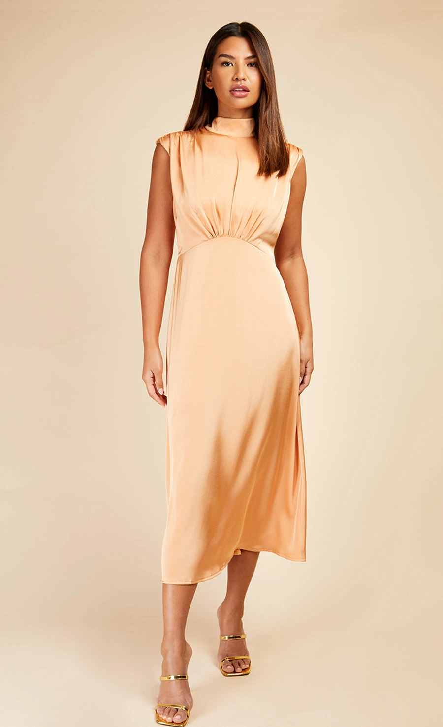 The midi dress that oozes vintage glamour, crafted in a sumptuous orange satin, complete with bow detail high neck and gathered shoulders. Cut on the bias for an ultra-elegant shape.