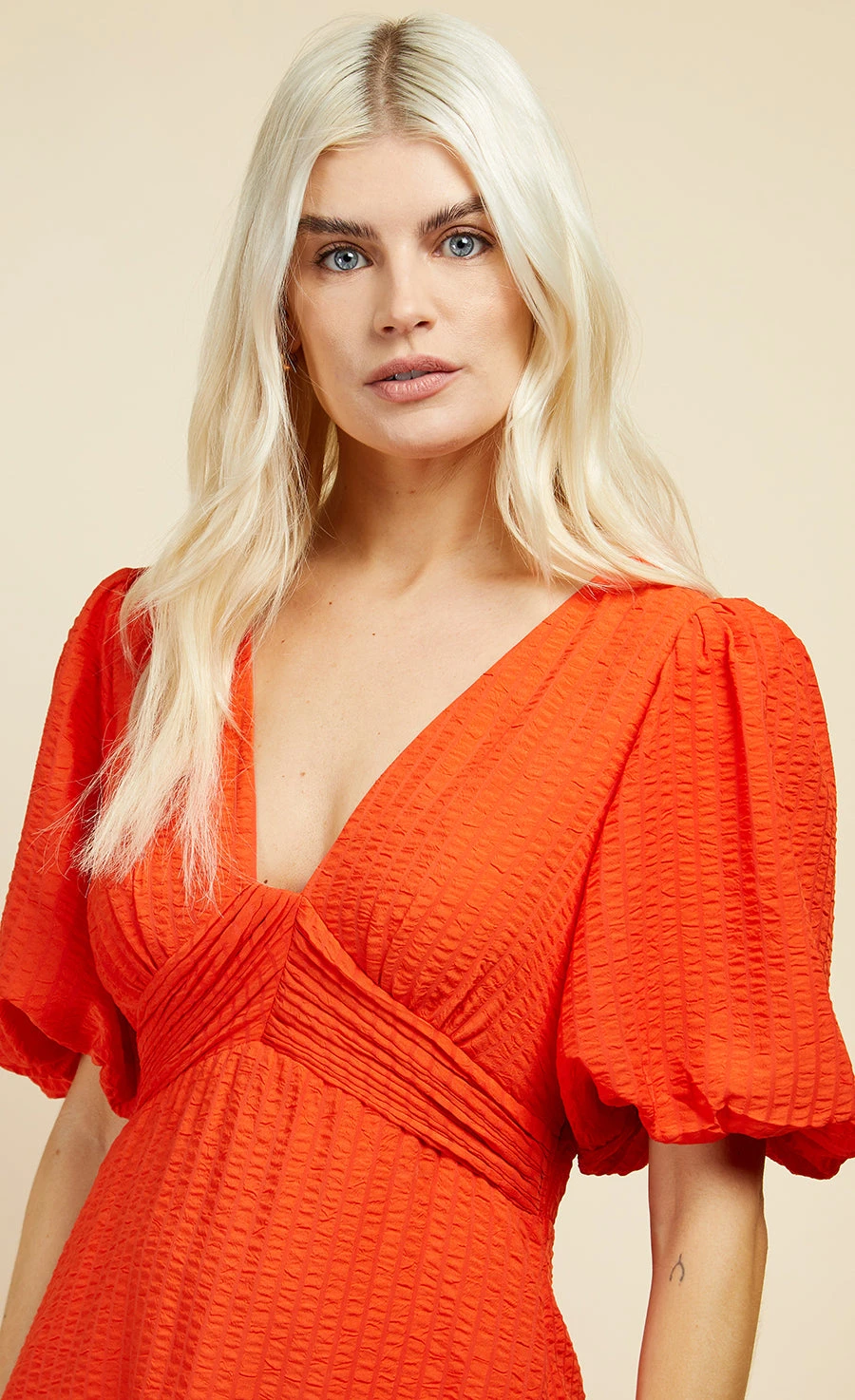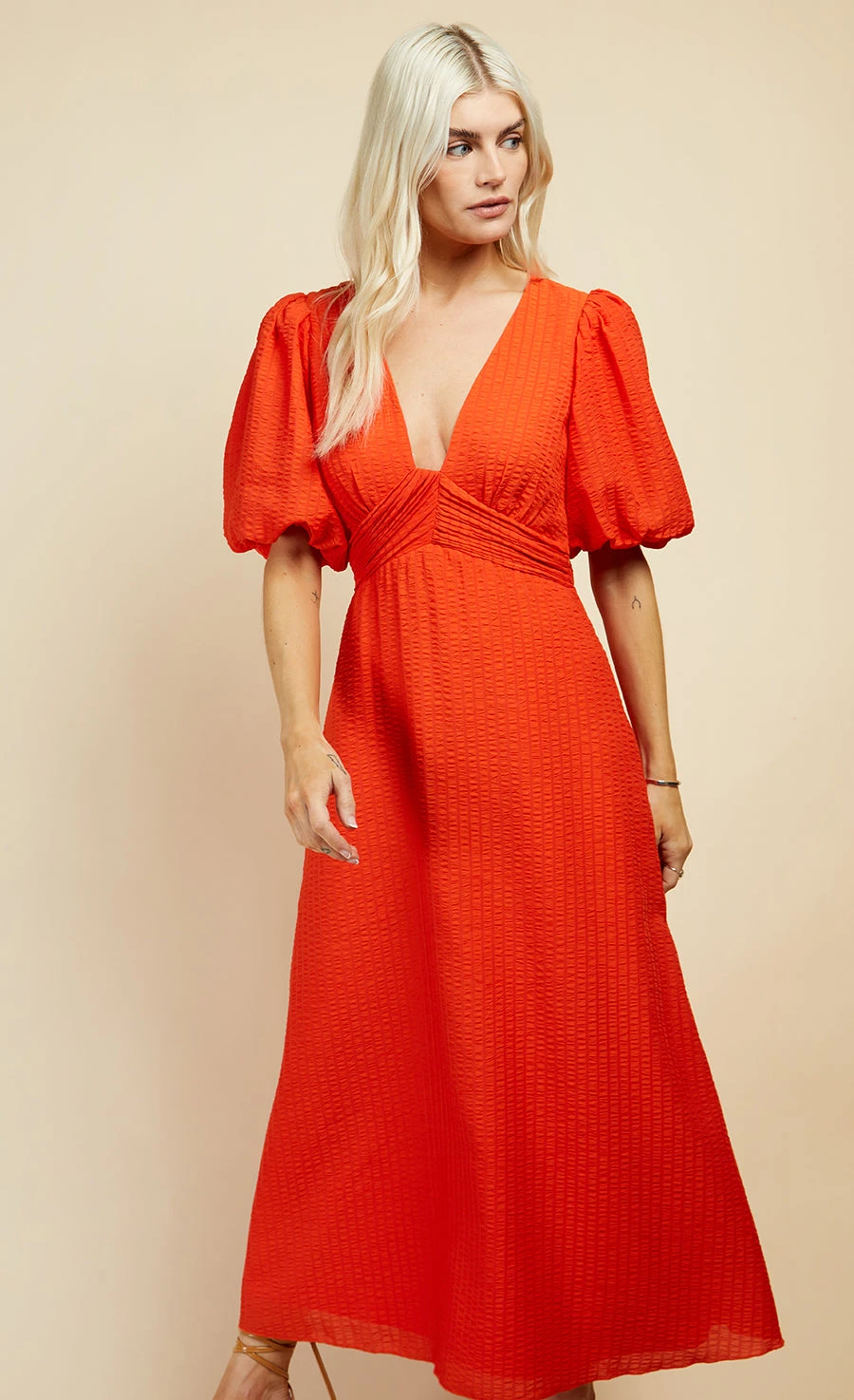 Stand out this summer in our stunning orange seersucker dress. With feminine puff sleeves, flattering ruched waist and a breezy maxi hem, it’s made for sunny days exploring markets or sipping Aperol Spritzes at summer weddings.