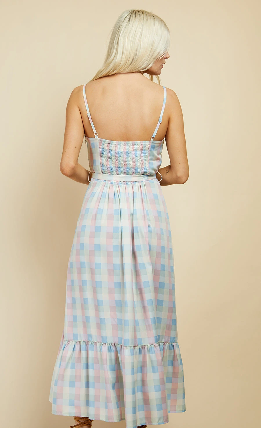 Float through summer in our easy breezy sundress. Splashed with cute pastel checks, it features cami straps, a waist-defining belt tie and feminine tiered midi hem. Add espadrille wedges for summer weddings, holiday dinners and BBQs in your besties garden. Print placement may vary.