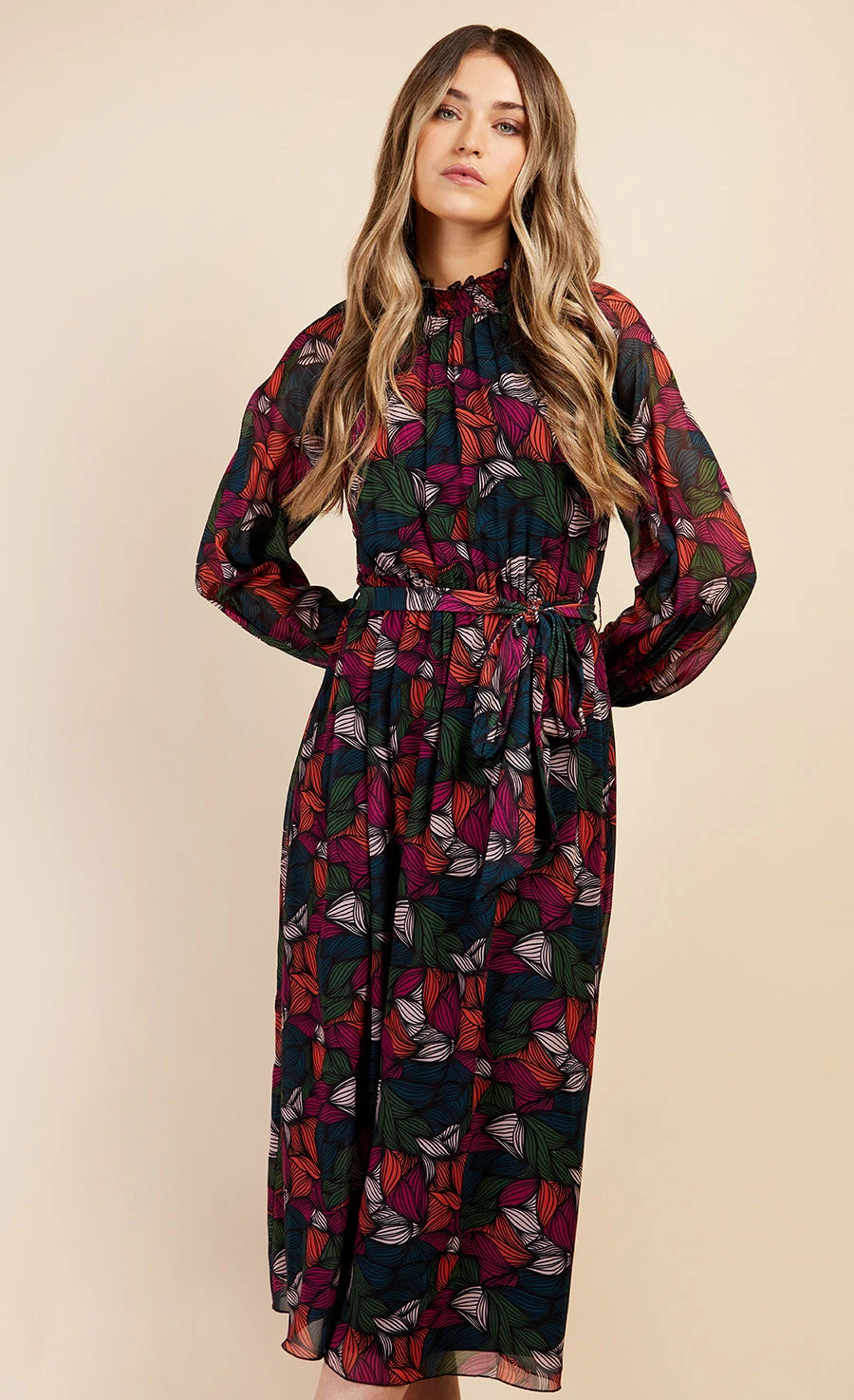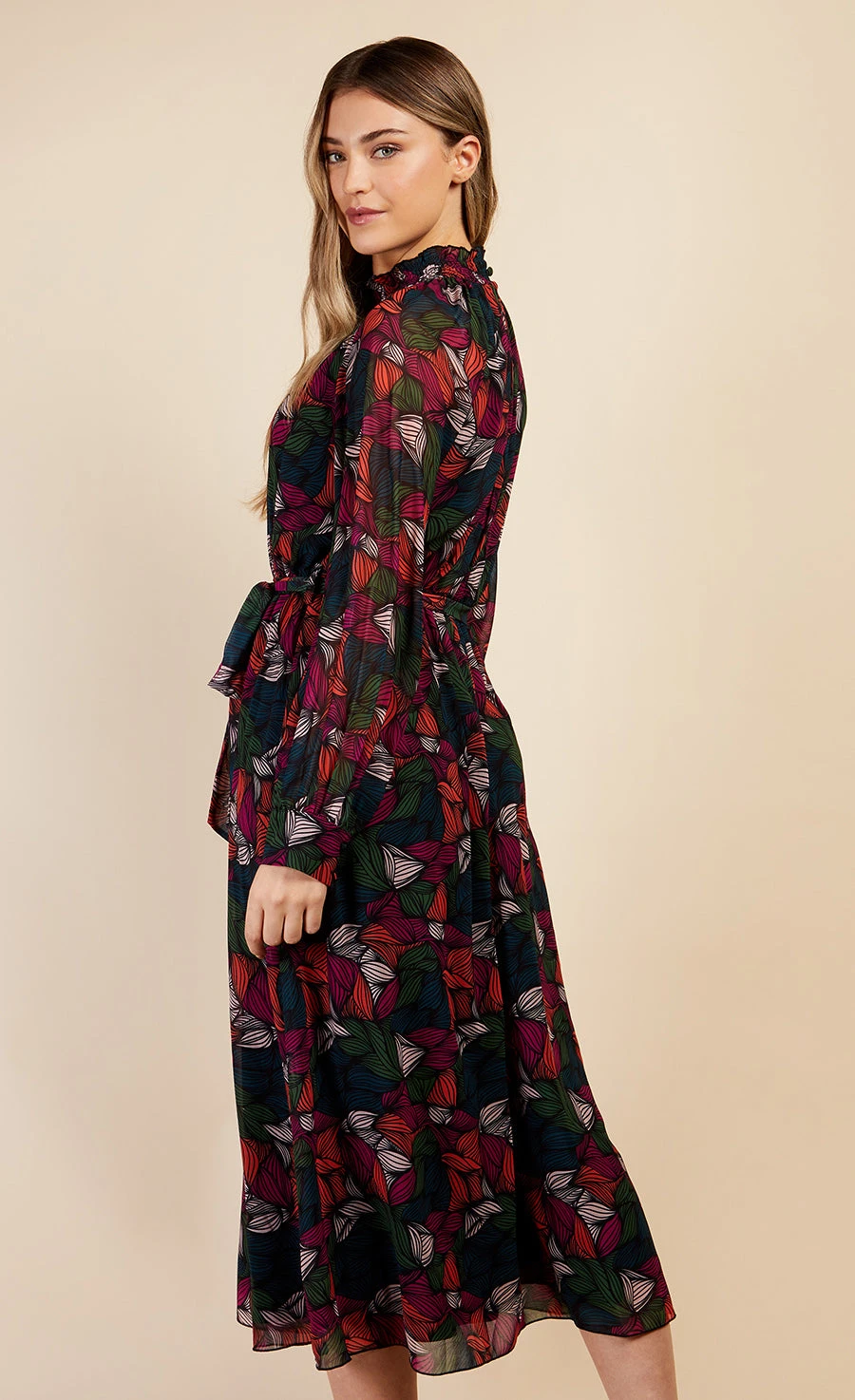 Dark florals; the perfect transitional print, an all-over abstract floral makes for a statement making new season midaxi. Featuring a high shirred neck, bold blouson sleeves and a self-tie belt, the ultimate desk to drinks dress. Print placement may vary.