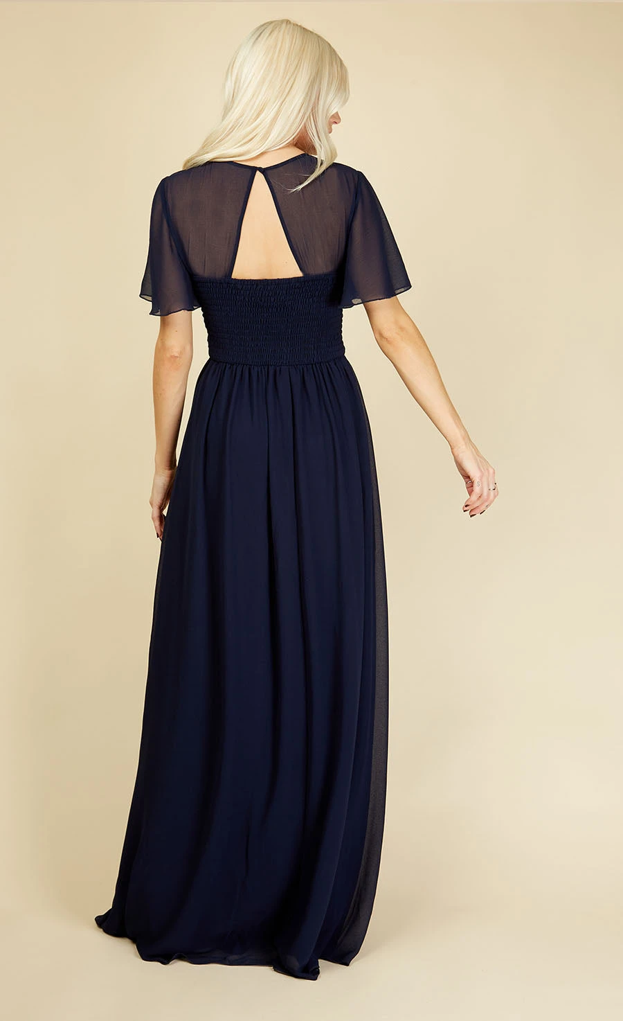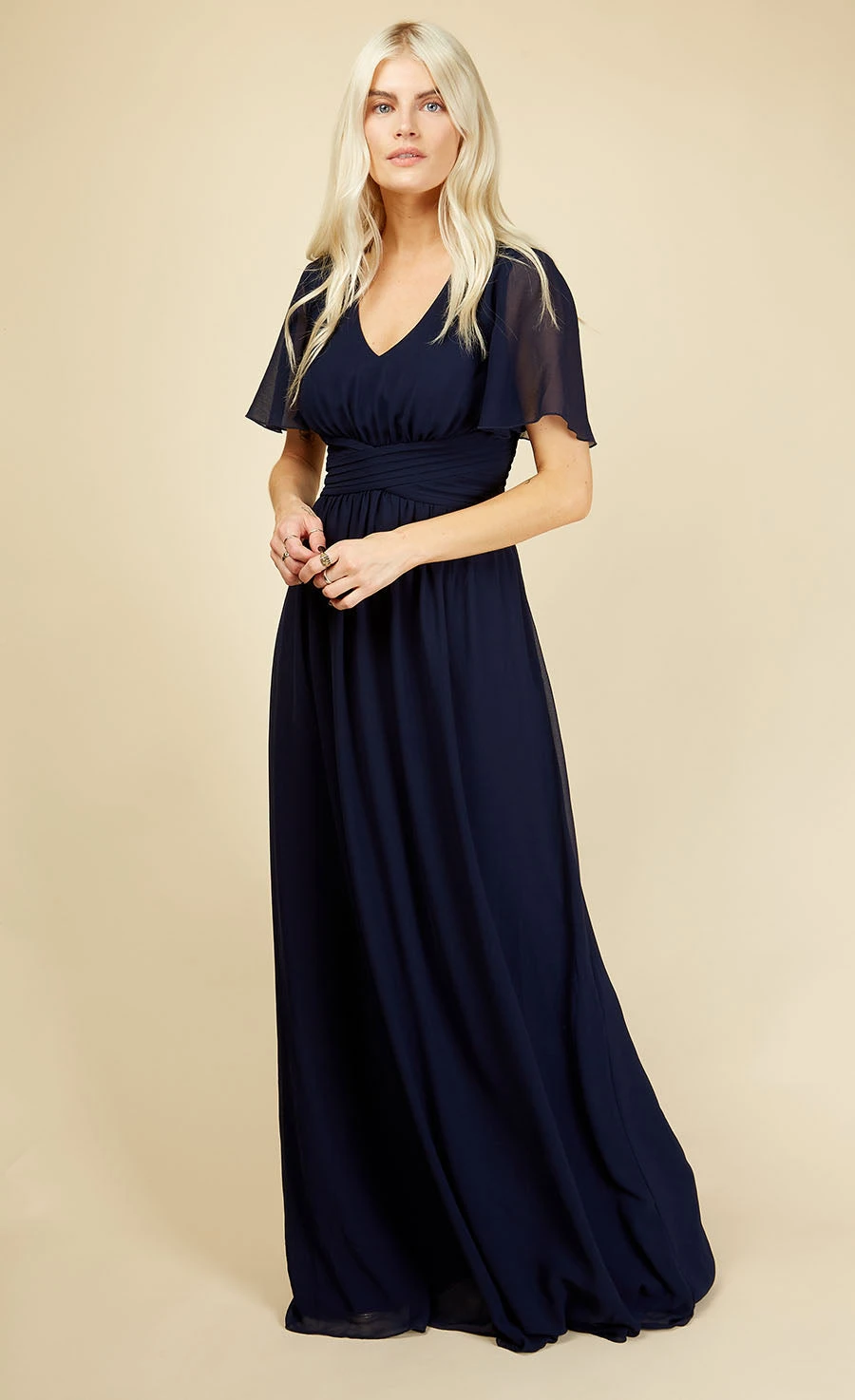 A heavenly navy chiffon gown that is perfect for bridesmaids and swish special events. We love the soft, draping sleeves that elegantly hang off the shoulders, the gathered bust detail.