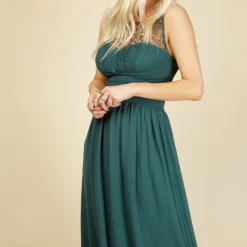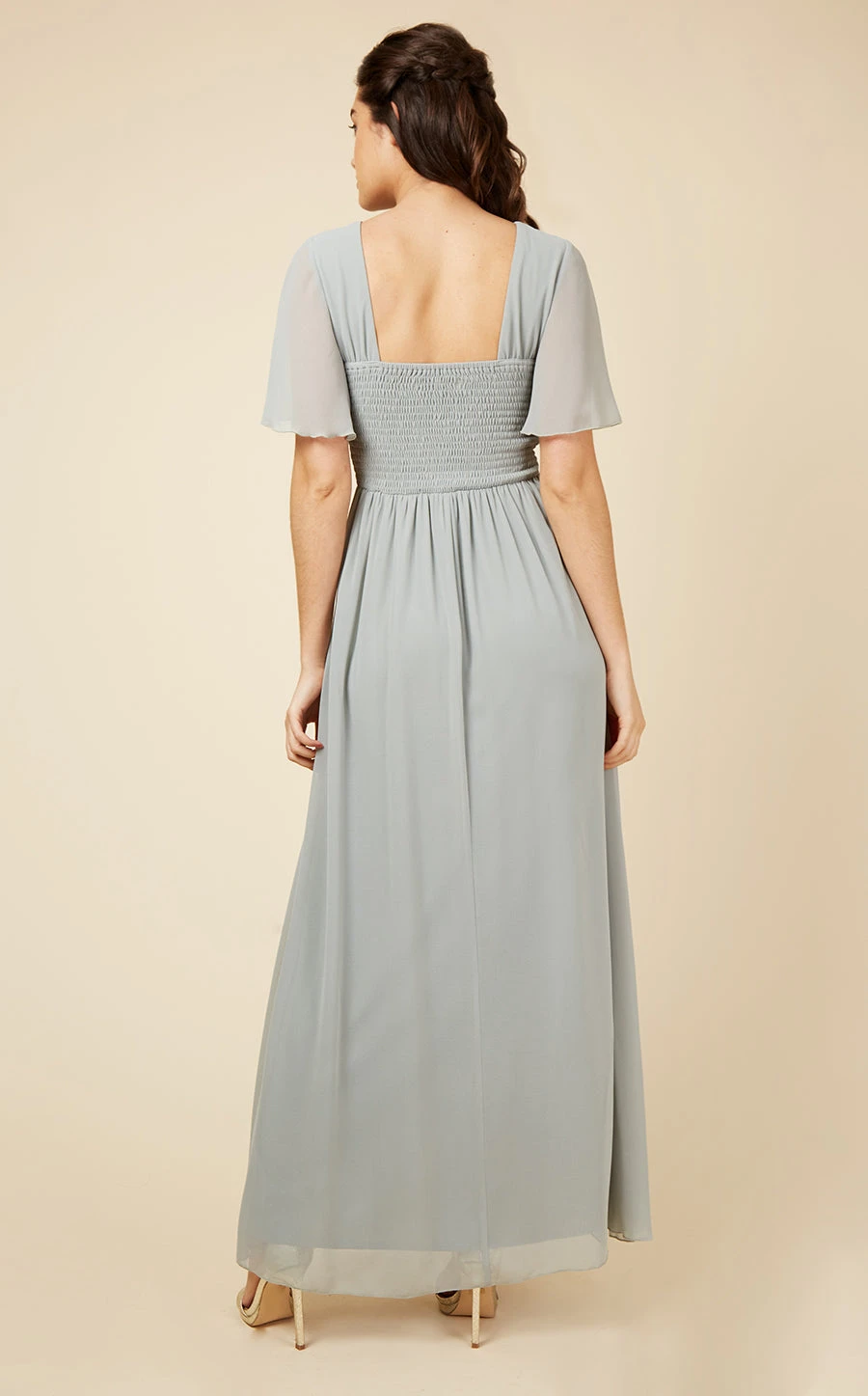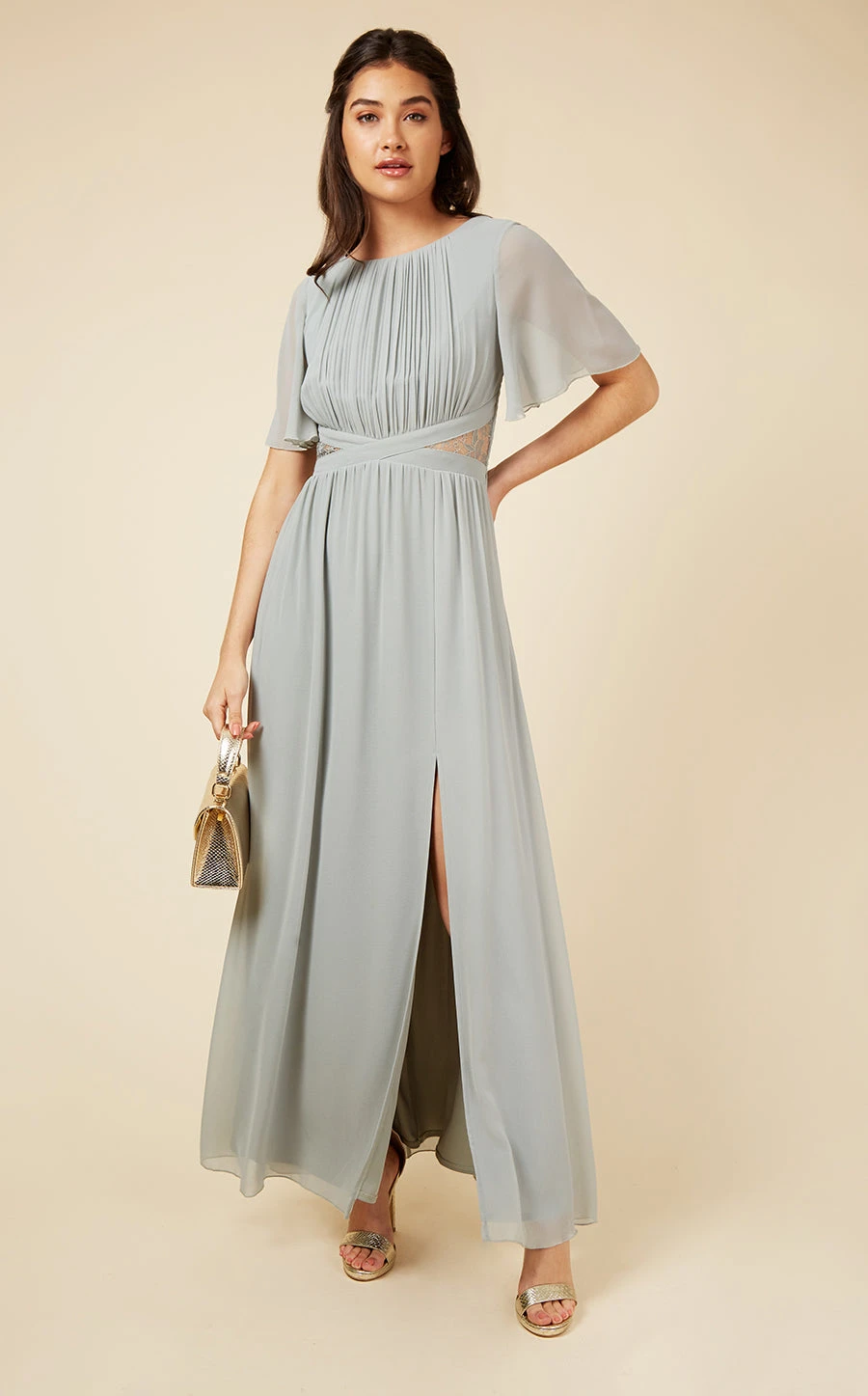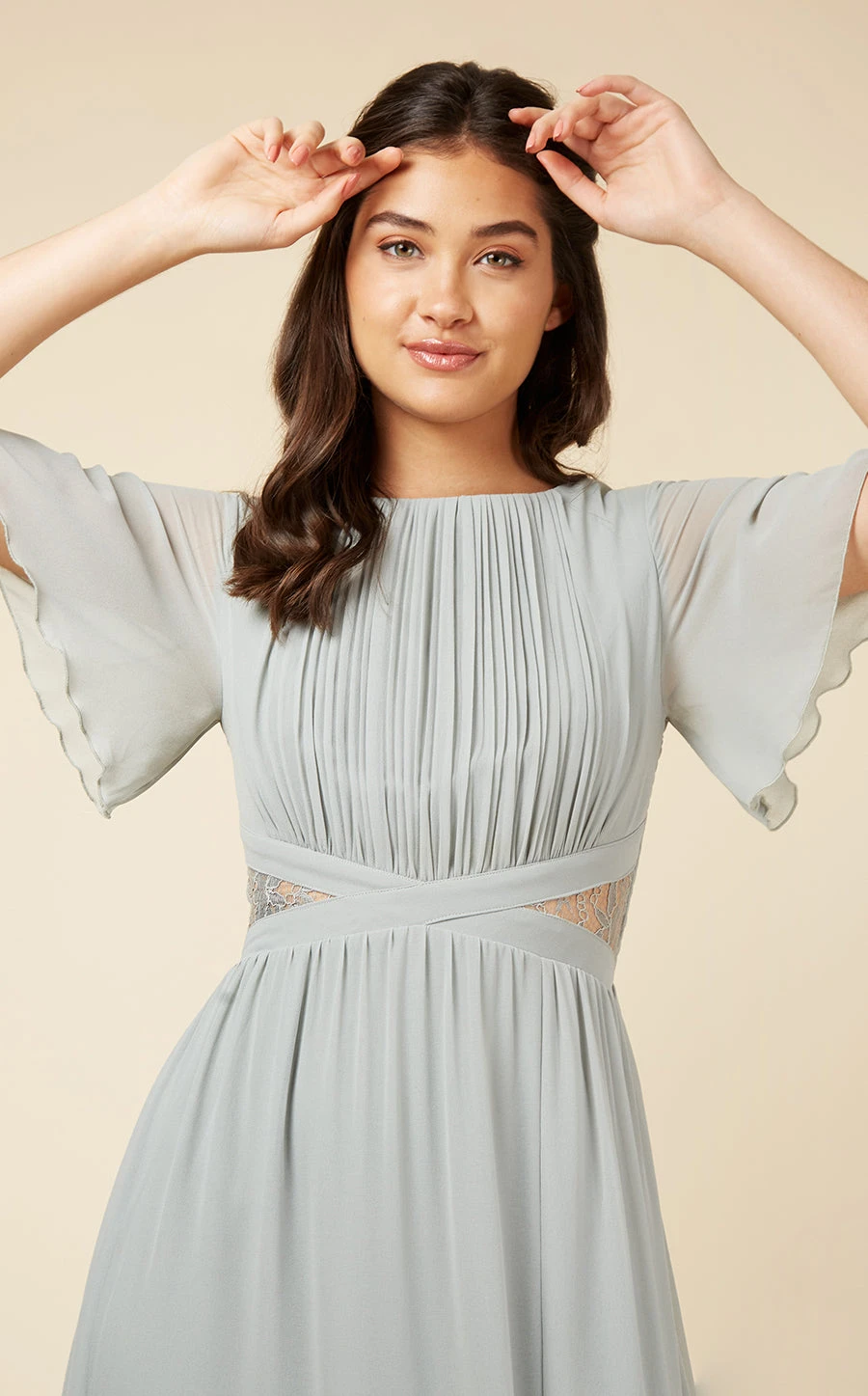 With floaty cap sleeves, a soft neckline and detailed waist, this romantic gown is a stunning bridesmaid option. It features chiffon and lace and comes in the sweetest shade of sage green.