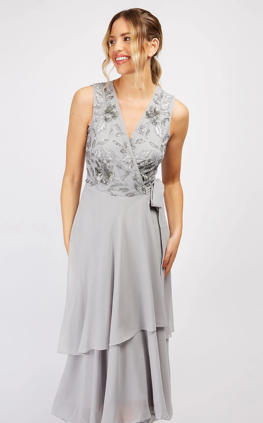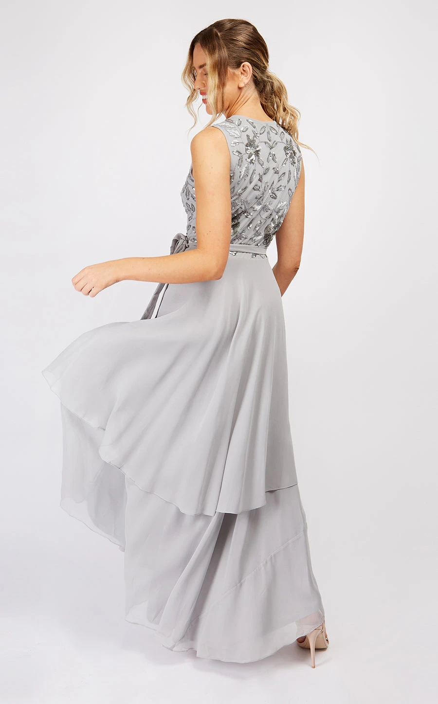A maxi hand embellished dress with tie waist detail.