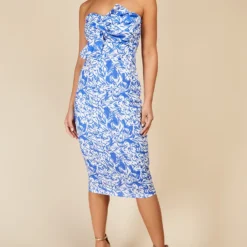Little Mistress Blue Floral Print Bow Detail Bandeau Midi Dress